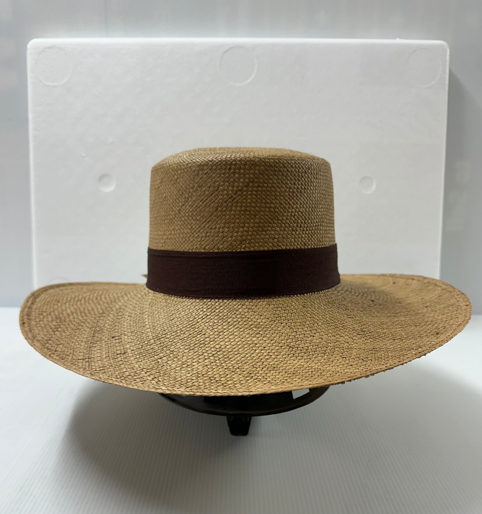 Hand woven 100% natural fibres rom the Iraca palm. Flat top crown. Unisex. Gross grain ribbon.  style characteristic is 9 cm wide brim. Great sun protection.