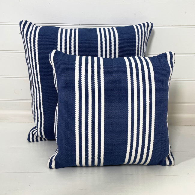 All-weather OUTDOOR CUSHIONS in classic naturals and bold designer stripes for luxurious outdoor spaces. Poolside or alfresco areas are effortlessly transformed with resort-style sophistication, comfort and quality. New DURBAN Stripe Covers in denim/white in polypropylene are soft to touch, UV resistant and weatherproof. See also a coordinated range of floor rugs. Heavy duty.